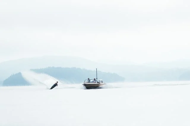 Bring your skis over, I said, and a waterski rope. I had a plan. By noon we had built a kicker of a jump on one side of a road and a landing ramp on the other. I fired up my family’s snow machine and packed out a runway. As usual, Caleb volunteered to be the guinea pig.