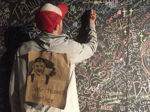 Remy adds Caleb's name to the mural at the All Souls Procession in Tuscon, AZ. The event gathers thousands to parade and celebrate lost loved ones each year. Remy and Anna Morenz carried the poster and a candle in Caleb's memory.