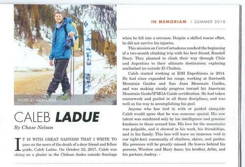 On October 22, Caleb Ladue took his last run. He had broken trail that day up Cerro Cortaderas(17,050 feet) near Santiago, Chile—his and a partner’s first of many ice and ski objectives in the central Andes. But when his partner felt signs of altitude sickness and the conditions worsened below the summit, the team, which included three Chilean guides whom they had befriended, decided to turn around. Caleb also led the ski descent. Near base camp, he disappeared into a crevasse.